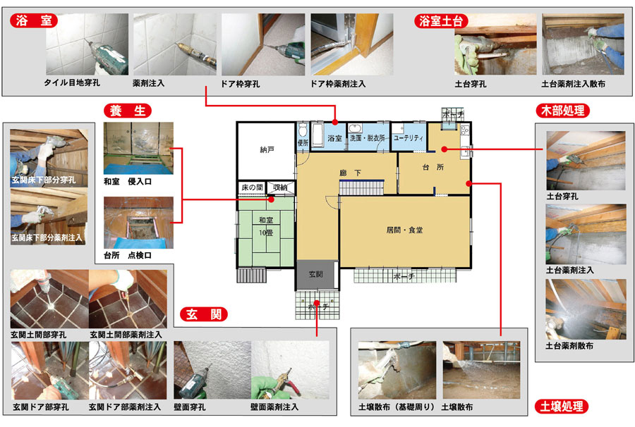 シロアリの被害進行を止め、駆除する施工で、床下木部や土壌・コンクリートスラブ下部に薬剤の注入・散布を行います。薬剤は、「日本しろあり対策協会」「日本木材保存協会」で認定されたものを使用しています。人に優しく、環境にも配慮した安全な施工方法です。